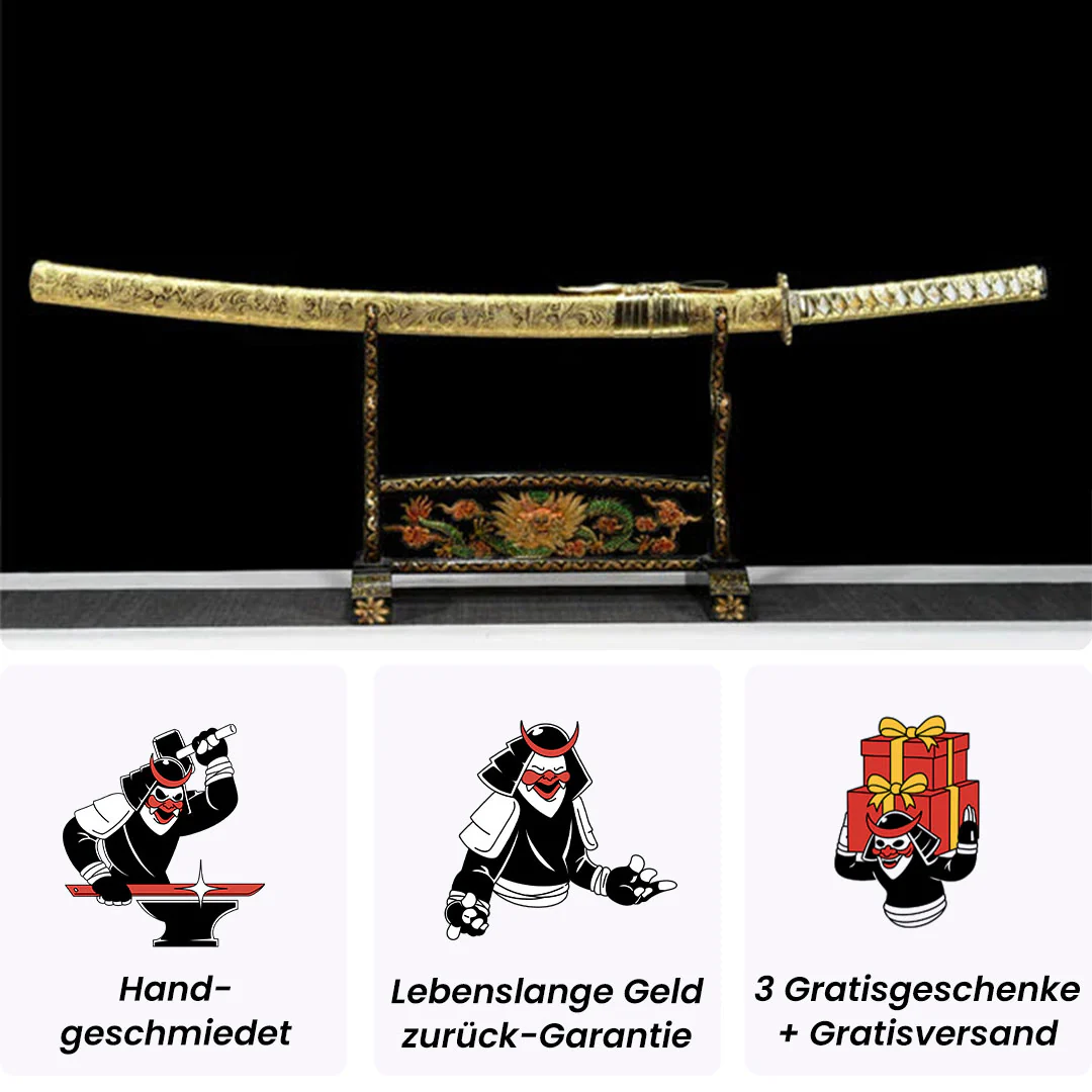 Entdecken Sie das Gold Katana, ein wunderschön geschnitztes japanisches Schwert, verziert mit einem majestätischen goldenen Drachen. Handgeschmiedet aus hochwertigem Stahl, ist dieses Stück ein künstlerisches Meisterwerk und eine gefährlich scharfe Waffe. Für Liebhaber der Kampfkunst und der japanischen Kultur ist es ein Symbol für Kraft und Schönheit.