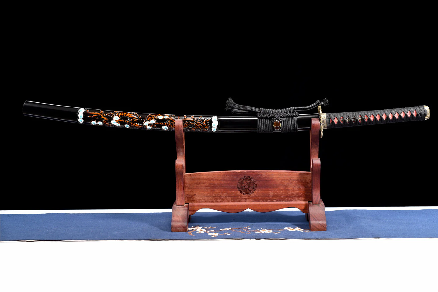Entdecken Sie das Katana Céleste, ein außergewöhnliches Samurai-Schwert, geschmiedet aus hochleistungsfähigem Manganstahl, einem Kohlenstoffstahl 1075. Behandelt mit einem violetten Röstverfahren. Dieses Schwert ist das Ergebnis eines sorgfältigen Prozesses, handgeschmiedet. Der Saya ist von einem Kunstschüler handbemalt.